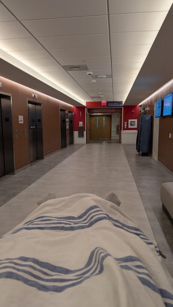 Cameron came to deliver me to my patient room. (Single room. No need for anxiety.). This room was at least a ten minute walk, so I harangued my Mom to leave and ask Christian to drive her home. The journey for my Mom would have been different. For Cameron and I it was through empty patient only tunnels painted all white with some decorations and several elevators. It was exciting. I compared it to Severance, but Cameron had never seen it. When I told her it was very good but a little weird. She asked if I liked Midsommar. I had never seen that, but I was confident to say no. She said that was good, but a little weird, too.